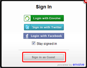 2. Setelah muncul jendela baru Anda bisa menggunakan account facebook, twitter, envolve sendiri maupun login dengan nama baru sesuka anda dengan cara memilih Sign in as Guest pada pilihan paling bawah berborder merah.