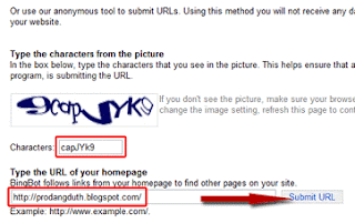 3. Pada halaman baru, gulir ke bawah dengan mouse anda. Masukkan URL blog yang anda submit, masukkan Characters: yang terdapat pada gambar. Lalu klik Submit URL.