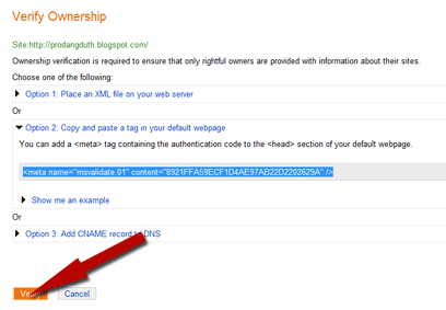 12. Sekarang anda kembali lagi ke webmaster Bing Verify Ownership, klik Verify.