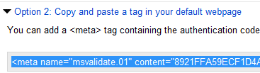 10. Jika sudah ketemu, anda kembali ke halaman webmaster Bing Verify Ownership Option 2. blok meta yang disediakan lalu Copy.