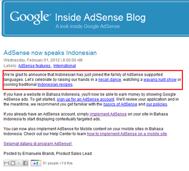 Bersyukurlah rekan-rekan Blogger Indonesia, pada tanggal 01 February 2012 Google Adsense resmi mendukung bahasa Indonesia. Berita tersebut seperti diberitakan di blog adsense (http://adsense.blogspot.com/2012/02/adsense-now-speaks-indonesian.html) yang terbaca seperti ini: